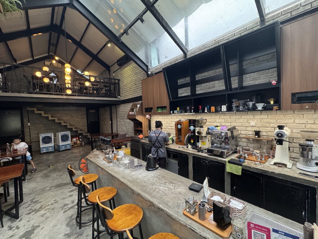 店内は煉瓦の壁と吹き抜け天井が印象的で、落ち着いたインダストリアルな雰囲気です。