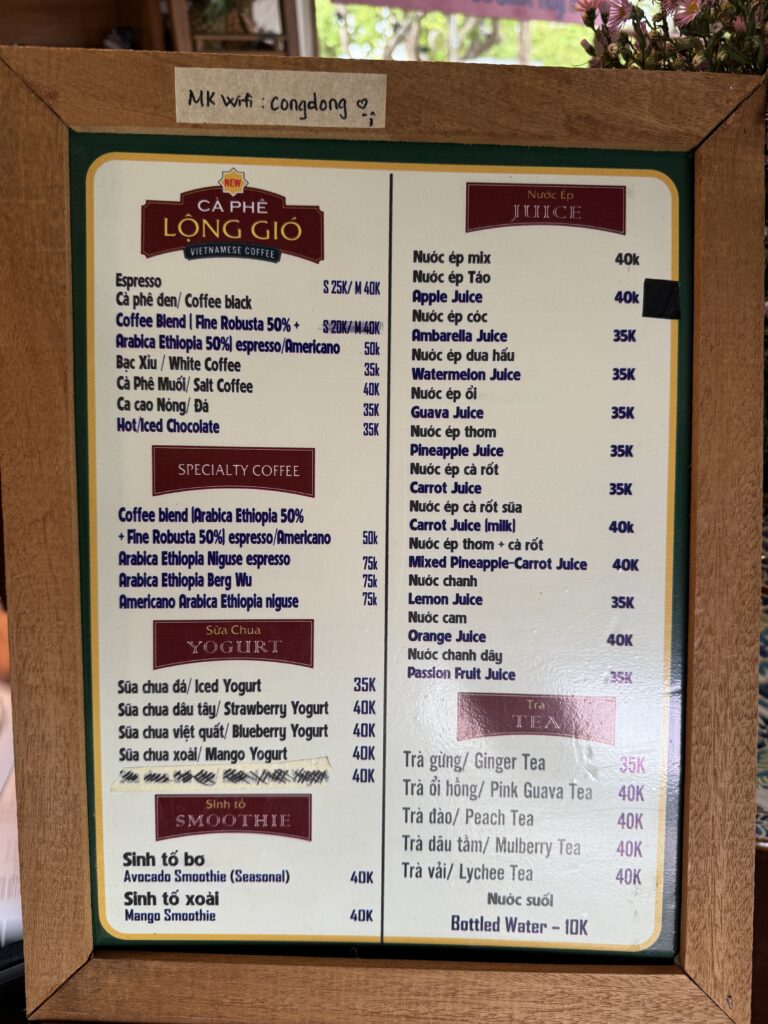 コーヒーは**25,000〜40,000VND(約150〜250円)**ほど。
